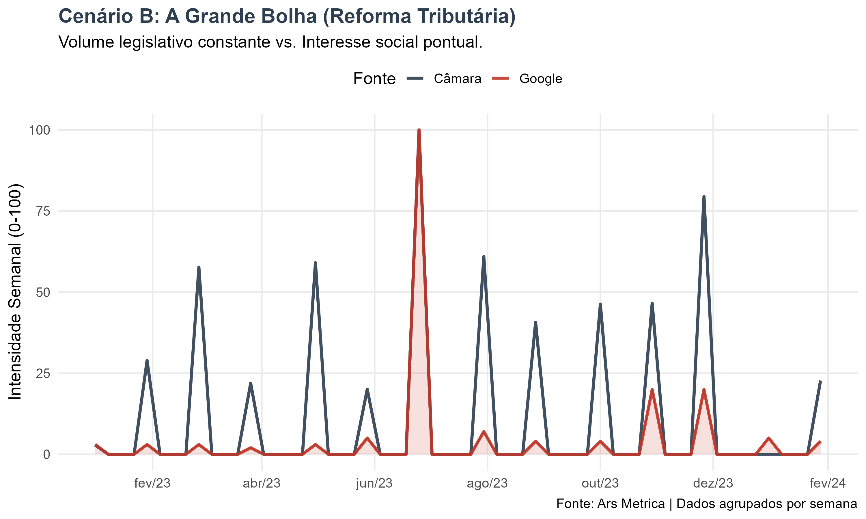 Para corrigir isso e revelar a tendência real, nossa metodologia agrupa os dados semanalmente. As curvas suaves que você verá abaixo representam o volume consolidado de cada semana, eliminando o ruído diário e permitindo uma comparação limpa entre a pauta do Congresso e o interesse do Google.