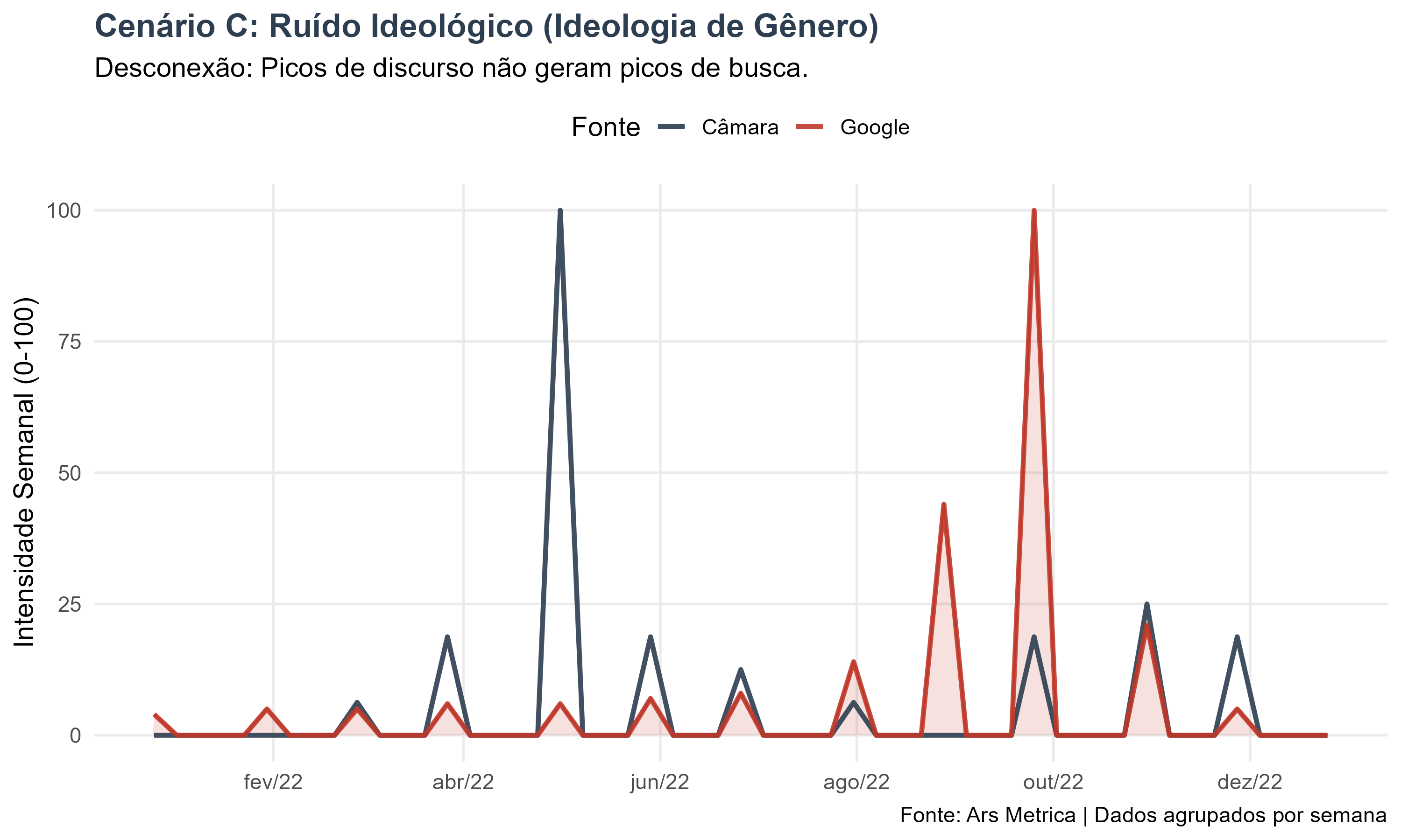Análise: A correlação negativa sugere agendas paralelas. Os picos de discurso na Câmara não coincidem com os momentos de busca da sociedade. Isso é clássico do “Position Taking”: o discurso não visa informar ou debater uma política pública (policy), mas sim sinalizar valores para uma base eleitoral específica. O político fala para o espelho ou para sua claque, gerando ruído sem sincronia com a agenda pública geral.